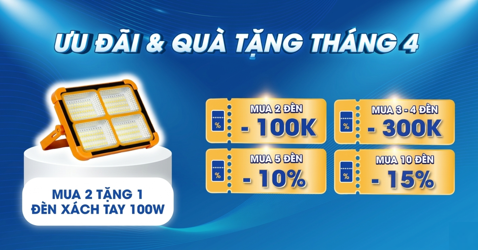 Khi mua 2 đèn pha chống chói toả 3 mặt năng lượng mặt trời trên website, khách hàng nhận ngay 1 đèn xách tay công suất 100W năng lượng mặt trời kèm voucher giảm giá theo giá trị đơn hàng. (Số lượng voucher có hạn - nhanh tay đặt mua để không bỏ lỡ)